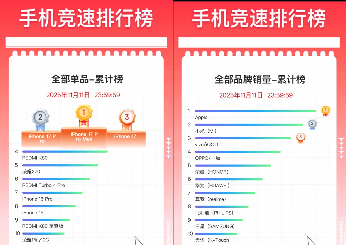Xiaomi, ikinci sırayı aldı ve en çok satan Çin markası olmaya devam etti. Redmi K80, toplam birim satışlarında dördüncü sırada yer alarak etkinlik sırasında en popüler akıllı telefon oldu. Redmi Turbo 4 Pro ve K80 Ultra da ilk 10’da yer alarak Xiaomi’nin yerli markalar arasındaki liderliğine katkıda bulundu.