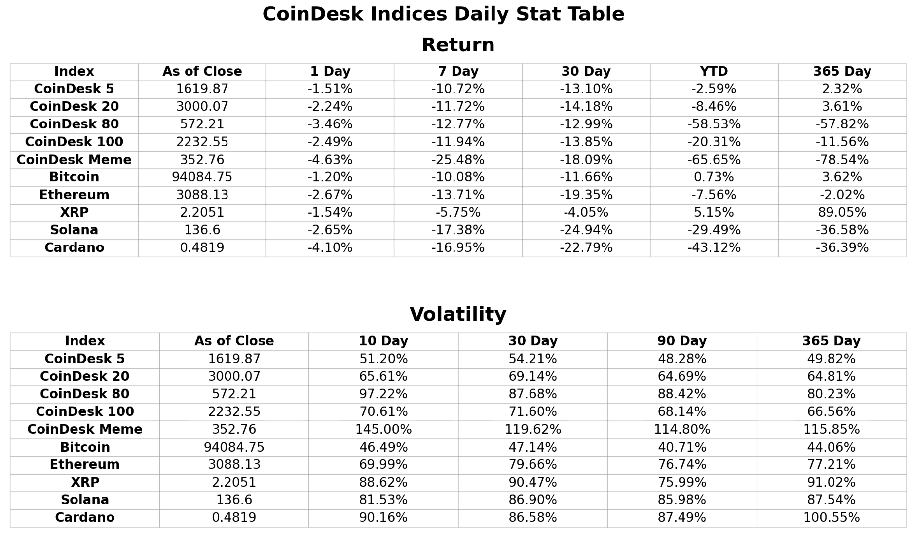 The CoinDesk 5 Index was up just over 2%, making it the only other winner, while ether saw a flat 2% gain. Meanwhile, rivals like solana SOL$141.61 and ADA$0.4962 suffered steep losses, both down more than 36%. The CoinDesk Meme Index posted the worst performance, down 78%, reflecting the heavy toll taken by the riskiest corners of the crypto market.